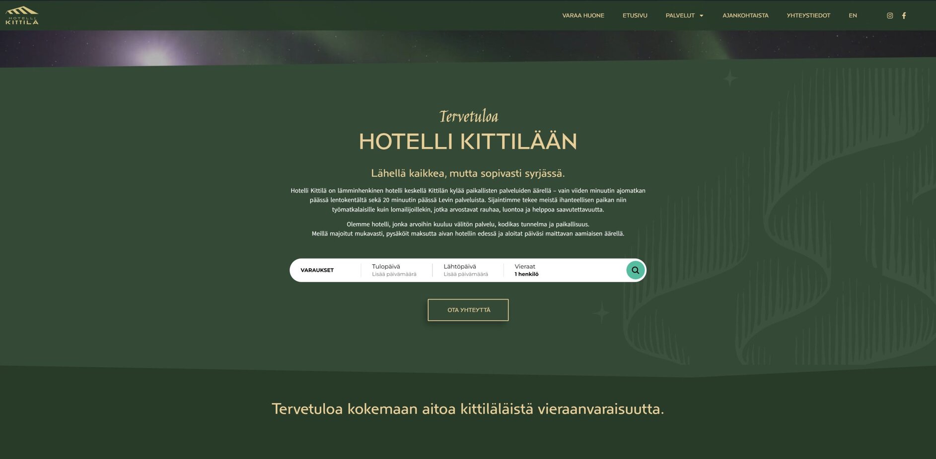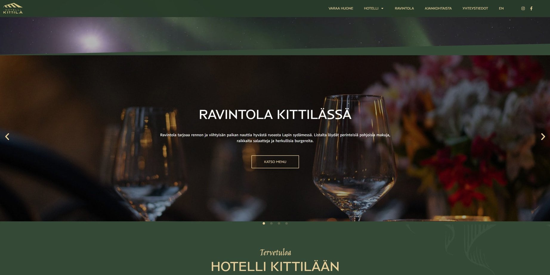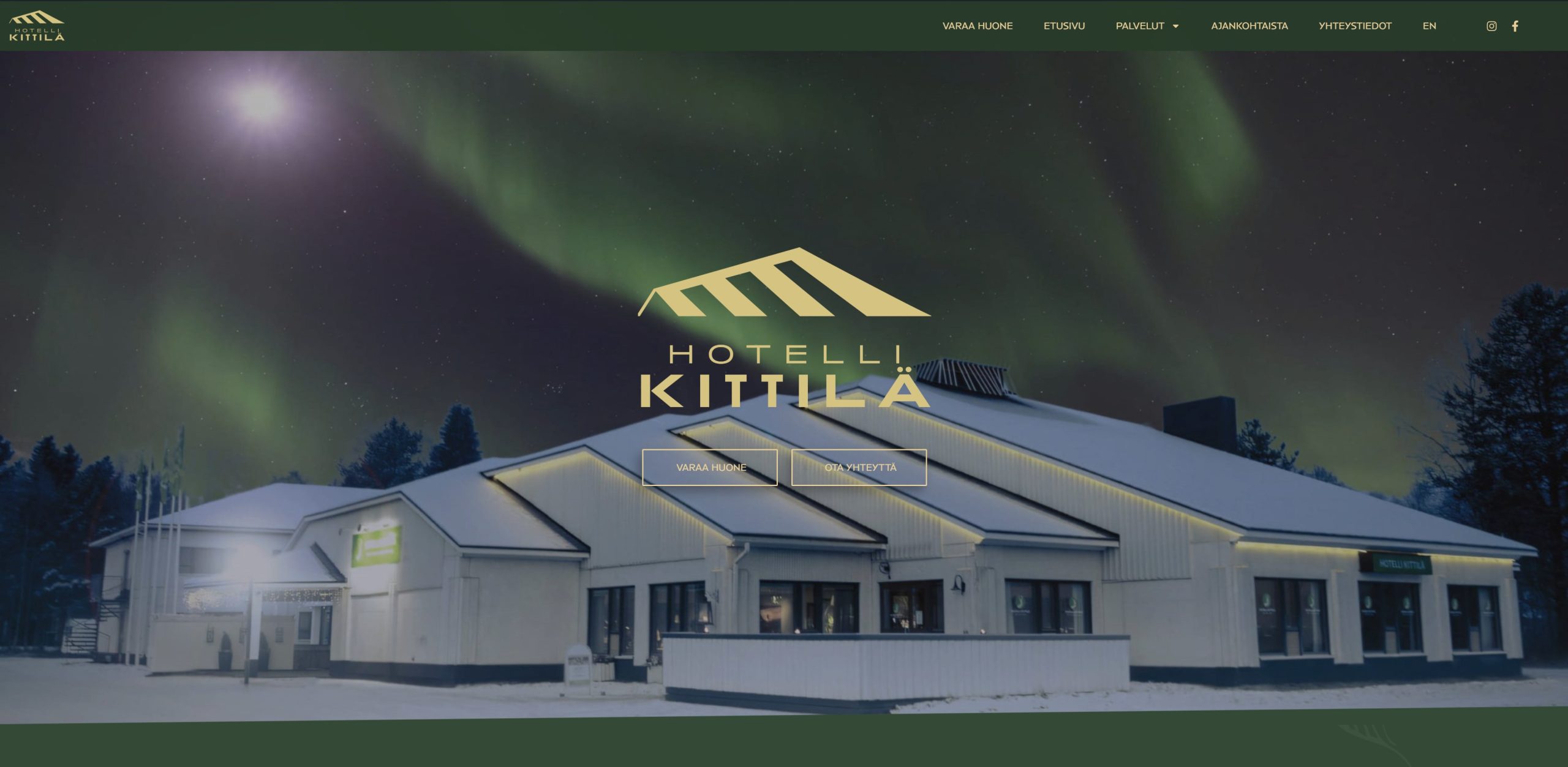 Toteutimme majoitus- ja ravintolapalveluja Kittilässä tarjoavalle asiakkaalle, Hotelli Kittilälle, verkkosivut, logon ja mainostaulujen sekä opastekylttien graafisen suunnittelun. Verkkosivuissa suunnittelimme ulkoasun ja rakensimme sivuston.