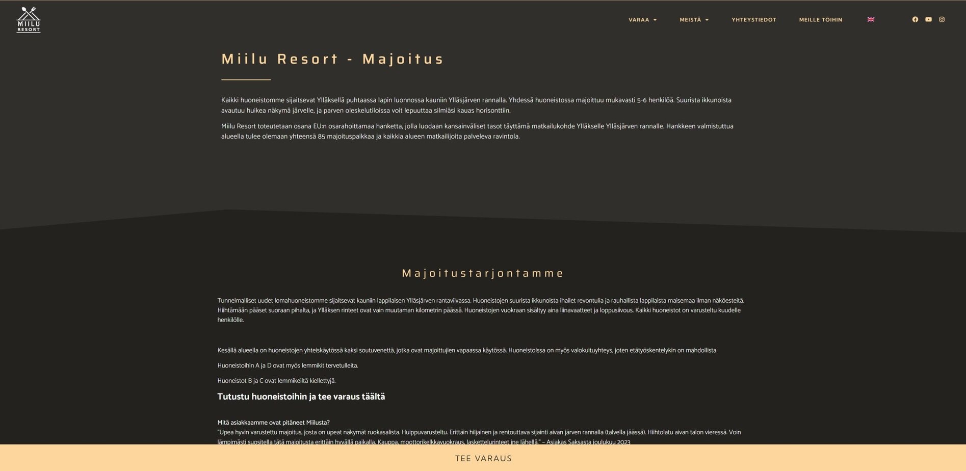 Toteutimme majoitus- ja ravintolapalveluja Ylläksellä tarjoavalle asiakkaalle, Miilu Resortille, verkkosivut, logon ja valokuvausta. Verkkosivuissa suunnittelimme ulkoasun ja rakensimme sivuston.