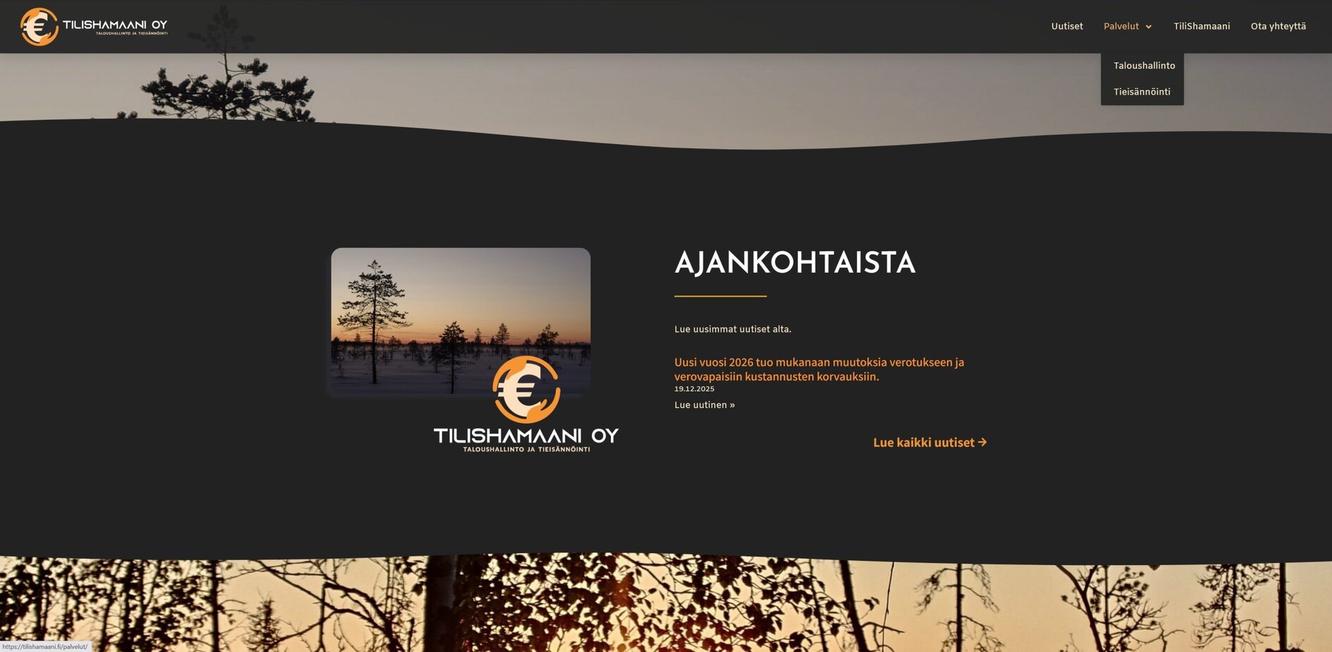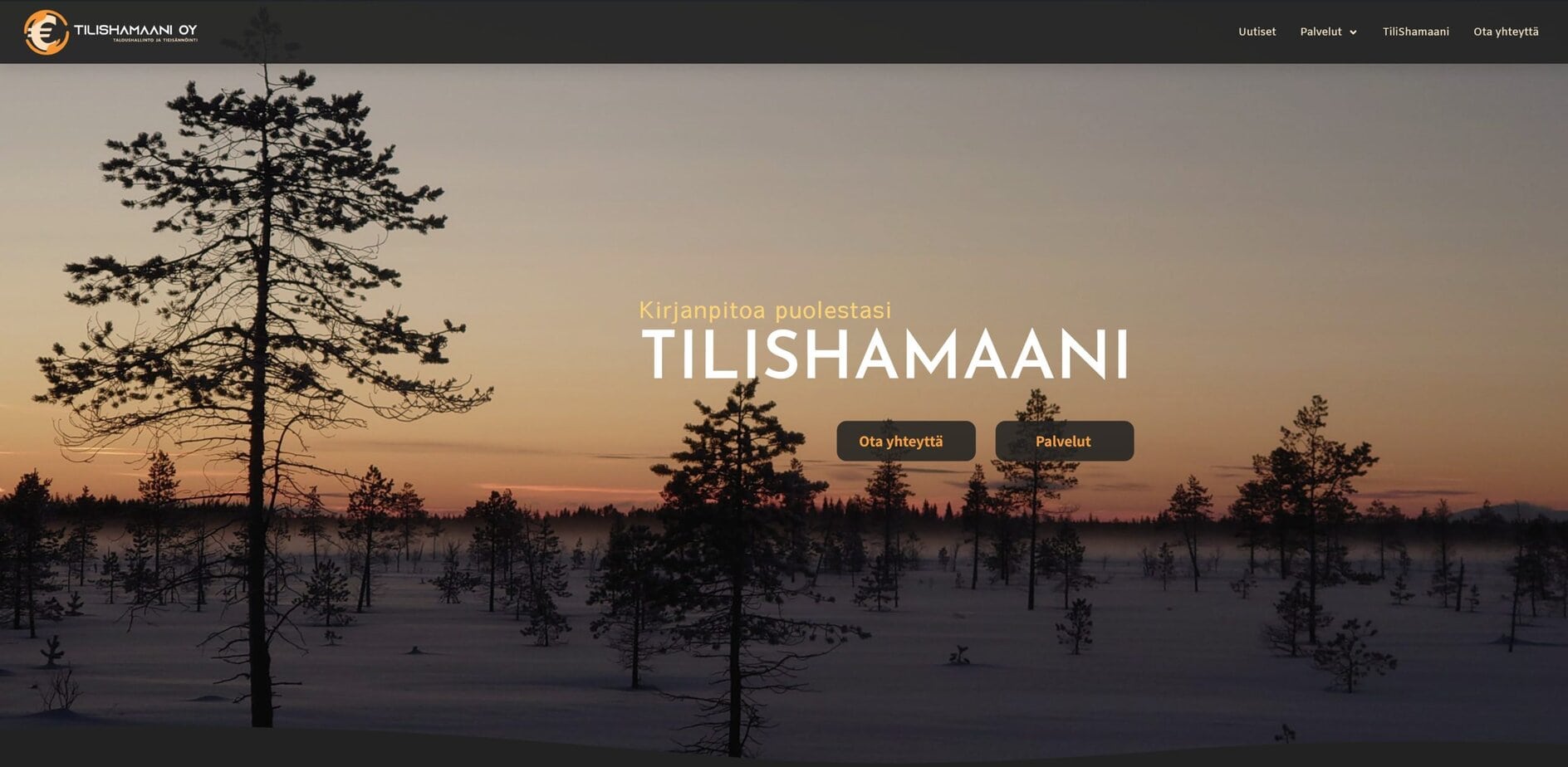 Toteutimme tilitoimiston palveluja tarjoavalle asiakkaalle Kittilässä, TiliShamaanille, uudet verkkosivut. Verkkosivuissa suunnittelimme ulkoasun ja rakensimme sivuston. Myös uudistimme logon värejä sivustoon sopiviksi.